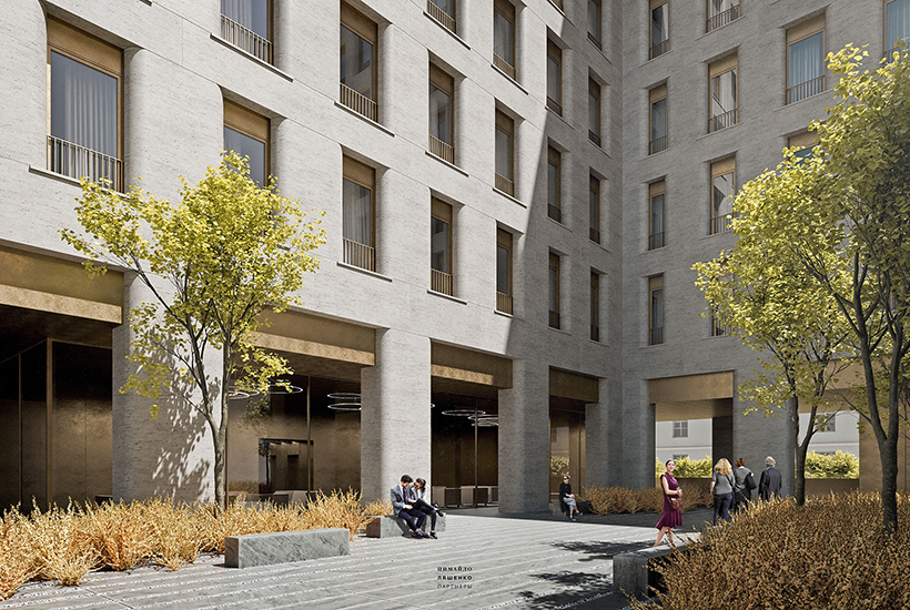 Общая площадь комплекса достигает 4,5 тыс. кв. метров. Архитектурный проект дома и интерьер входных групп разработаны бюро «Цимайло, Ляшенко и партнеры». В оформлении фасадов используют травертин, металл, витражное остекление, а общественных зон – венецианский терраццо, тибурский камень и многокомпонентный сплав.