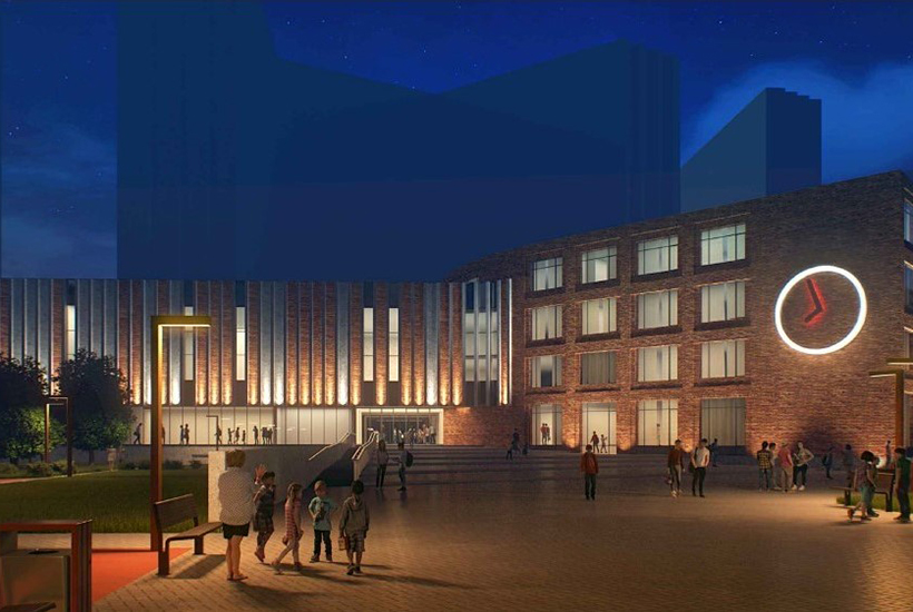 Внешний облик школы перекликается с архитектурой всего квартала: фасады здания облицуют керамической клинкерной плиткой, имеющей теплые кирпичные оттенки. Вертикальные акценты будут задавать ритмичные вставки, выполненные из архитектурного бетона. На фасадной части у главного входа сделают 5-метровый часовой циферблат, подсвечиваемый в вечернее время суток.