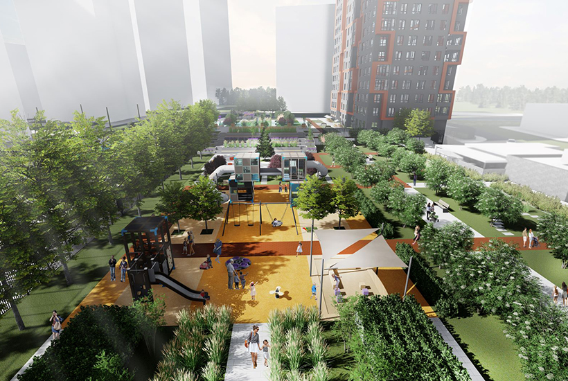 Спортивно-молодежное пространство также разделят на несколько зон. Это теннисные столы, скалодром, зона для паркура, занятий воркаутом и панна-футболом, а прилегающую стену паркинга можно будет использоваться для граффити. Одна часть детской площадки рассчитана на малышей, другая – на детей старшего возраста.