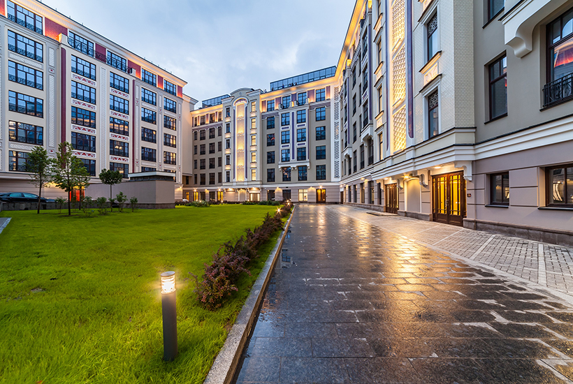 Группа компаний «Галс» утвердила новую концепцию оформления территории в комплексе класса де-люкс «Театральный дом» (на фото), построенном около Нового Арбата в Москве. Проект представляет собой интерпретацию взаимопроникновения особенностей стиля русский модерн с современным подходом к благоустройству. Предусмотрено освещение «Времена года» и непрерывный цикл цветения растений. Такие данные приводятся в пресс-релизе «Галса».