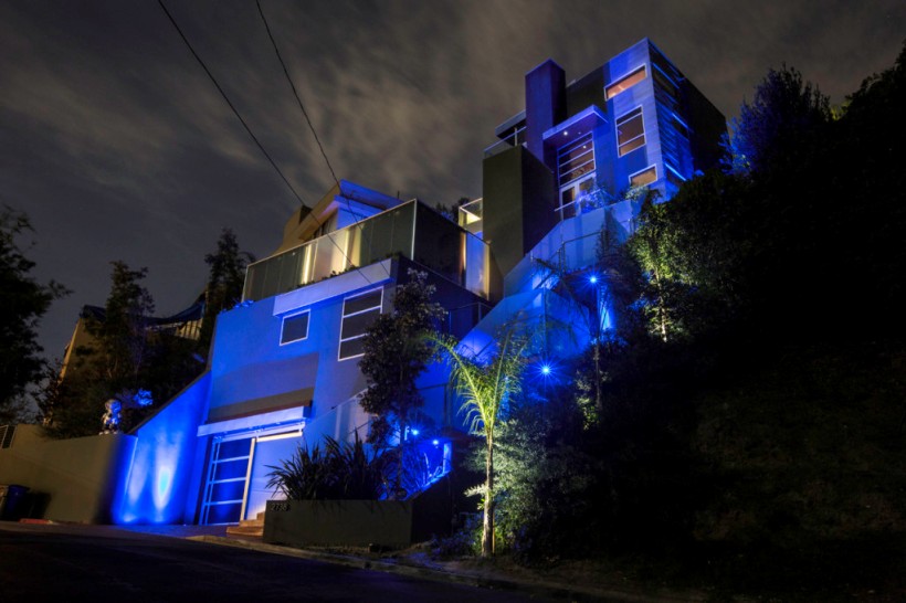 «Жуткий дом», как называют его соседи за граффити монстров на стенах, выполнен в чёрно-красном цвете с синей неоновой подсветкой фасада.