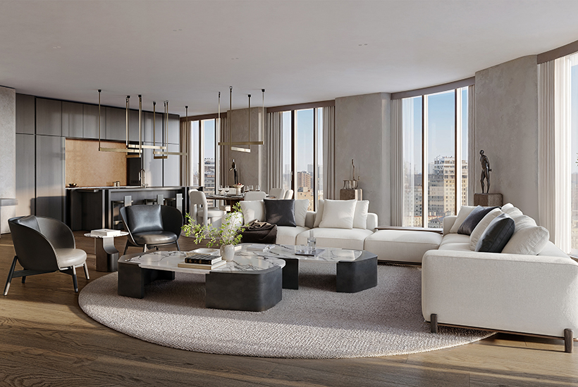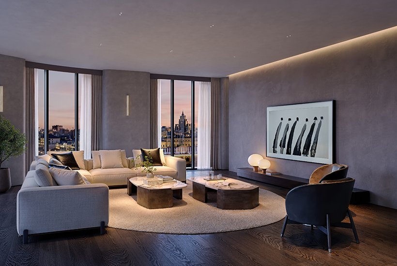 В доме спланировано 57 квартир на 2-7 этажах и четыре пентхауса на восьмом этаже. Квартиры имеют высоту потолков 3,2 м и площадь 90,4-276,3 кв. м, пентхаусы – потолки на 3,75 м и метраж 326,9-539,4 кв. м. Предусмотрены террасы. Жилье сдается с чистовой отделкой. Бронирование началось в первом квартале 2024 года, продажи – в ноябре 2024 года.