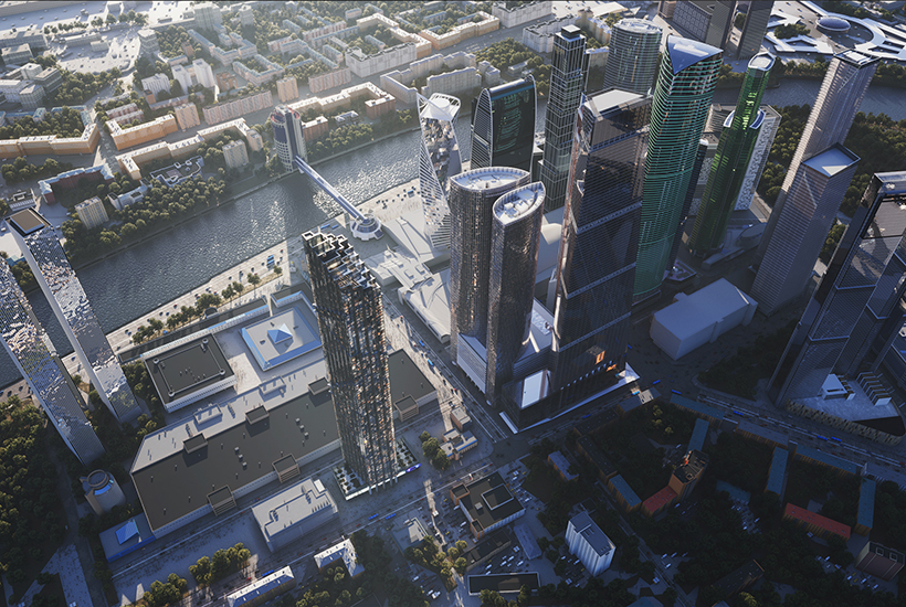 Описание. «Дом Дау» – 85-этажный жилой небоскреб премиум-класса (340 метров), получивший название в честь академика и лауреата Нобелевской премии Льва Ландау. Дом общей площадью 143,5 тыс. кв. м построят по монолитно-каркасной технологии с центральным ядром. Предусмотрены металлические импосты и декоративные треугольные консоли, размещение со смещением по диагонали и формирующие спираль, оплетающую башню. Вершина – каскад остекленных объемов и террас с прозрачными ограждениями.
