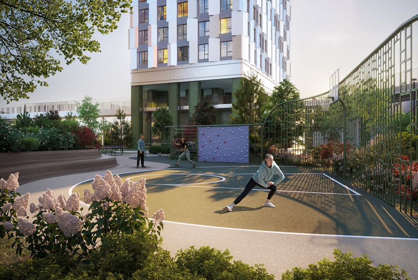 Внутренняя инфраструктура. В первых двух корпусах во входных группах появится консьерж-сервис от цифровой помощницы Ultima, зоны отдыха, колясочные и лапомойки. В корпусах будет 11 помещений общественного назначения общей площадью 2,4 тыс. кв. м. Во втором корпусе предусмотрена ритейл-зона с продуктовыми магазинами и рестораном с террасой. Корпуса объединит переходная галерея с возможность передвигаться между домами на уровне первого или по благоустроенной кровле. Во дворе площадью 2,6 гектара будут детская и спортивная площадки, амфитеатр, беседки, водные и арт-объекты, теплицы. На двух подземных этажах оборудуют подземный паркинг на 473 машино-места, включая десять машино-мест для электромобилей. Также здесь будет автомойка и 213 келлеров.
