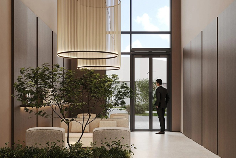 Внутренняя инфраструктура. У двух секций предусмотрен единый стилобат. Первые этажи отведены под входные группы, холл, зоны почтовых ящиков. Колясочные и лапомойки будут в каждой секции. Гранд-лобби с лаунж-зоной выполнят в минималистичном дизайне с использованием керамогранита, матового акрила и стекла, установят лестницу с подсветкой ступеней. Будет консьерж-сервис.