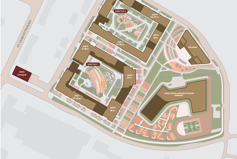 Проект реализуют в две очереди – это кварталы № 1 и 2. Первая очередь имеет площадь 201,3 тыс. кв. метров. Это две башни на 51 и 35 этажей и два дома переменной этажности от 7 до 28 этажей. Вторая очередь включает 10-этажный дом и три корпуса переменной этажности от 11 до 26 этажей.
