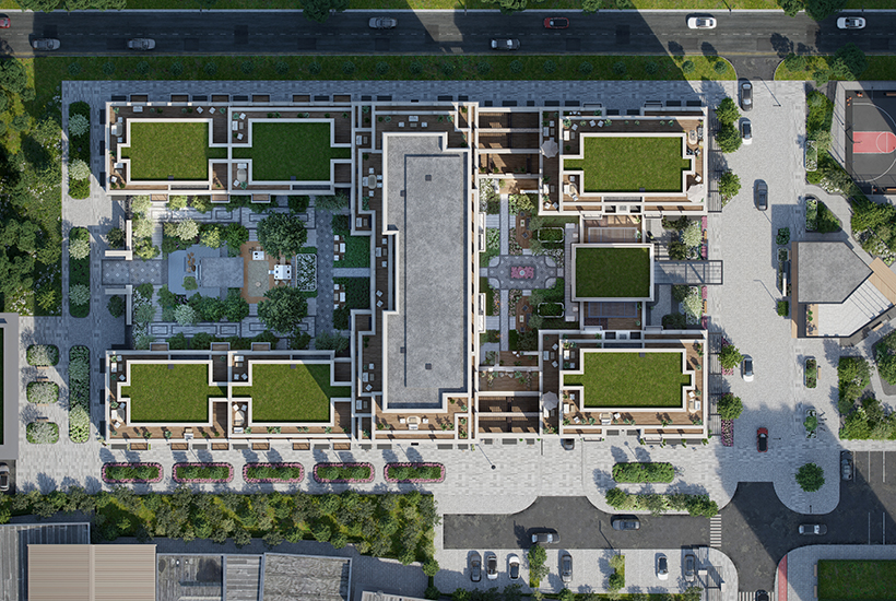 Первый этаж спроектирован как клуб для жителей. В инфраструктуру войдут два павильона с кафетерием, детским клубом и летним кинотеатром. Оборудуют одноуровневый подземный паркинг на 189 машино-мест.