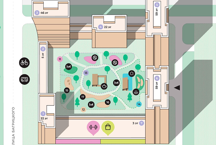 Откроются супермаркеты, рестораны, кафе, аптеки, химчистки, а также трехэтажный фитнес-центр с бассейном и панорамной крышей. Корпуса ограничат внутренний двор, где появятся четыре зоны: кленовая роща с зонами отдыха и спортивными площадками; «волшебный лес»; чайная-сад; центральная площадь с прудом, зоной коворкинга, библиотекой и амфитеатром. Также оборудуют три детские площадки для детей разного возраста. Пространства объединят сетью маршрутов.