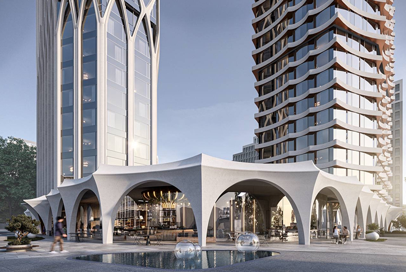 Проект. «А22» – жилой комплекс бизнес-класса с общей площадью 63,6 тыс. кв. м включая 45,3 тыс. кв. м жилья. Это два корпуса высотой 35 и 43 этажа и общий одноэтажный стилобат на участке площадью 0,8 гектара. Фасады секций облицуют светлым стеклофибробетоном, стилобата – светлыми панелями. Они образуют аркаду со скульптурными навесами. Сделают технические углубления для блоков кондиционеров. Пространства оформят вертикальными ламелями в высоту этажа либо закроют перфорированными панелями медного цвета.