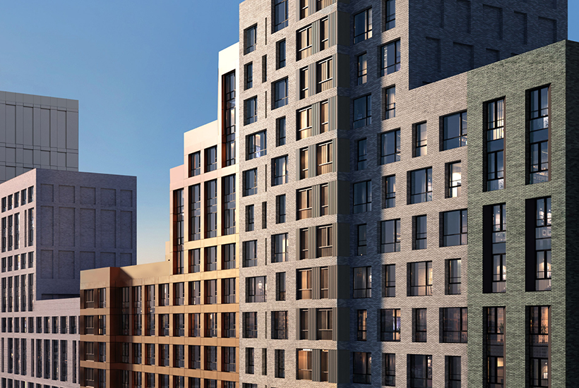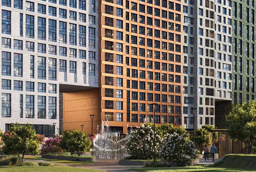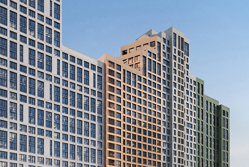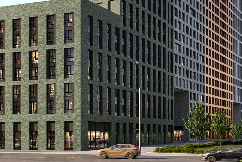 Первая очередь – дом высотой от семи до 30 этажей (63,3 тыс. кв. м, включая 37 тыс. кв. м жилья, 874 квартиры, 261 машино-место в паркинге и 213 кладовок). Фасады облицуют бетонной темно-зеленой и светло-серой плиткой, алюминиевыми панелями желтого, белого и черного оттенков, антрацитово-серым стемалитом. Первый корпус сдадут в третьем квартале 2028 года.