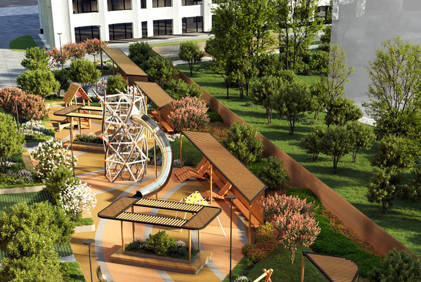 Создадут двор с высокими арками, несколькими тематическими зонами, местами для активного досуга, прогулок с детьми и тихого отдыха. Игровые системы для детей организуют в формате playhub. Высадят многолетние травы и цветы, декоративные кустарники, вечнозеленые деревья. Оборудуют подземный паркинг с увеличенными парковочными местами и с кладовыми помещениями.