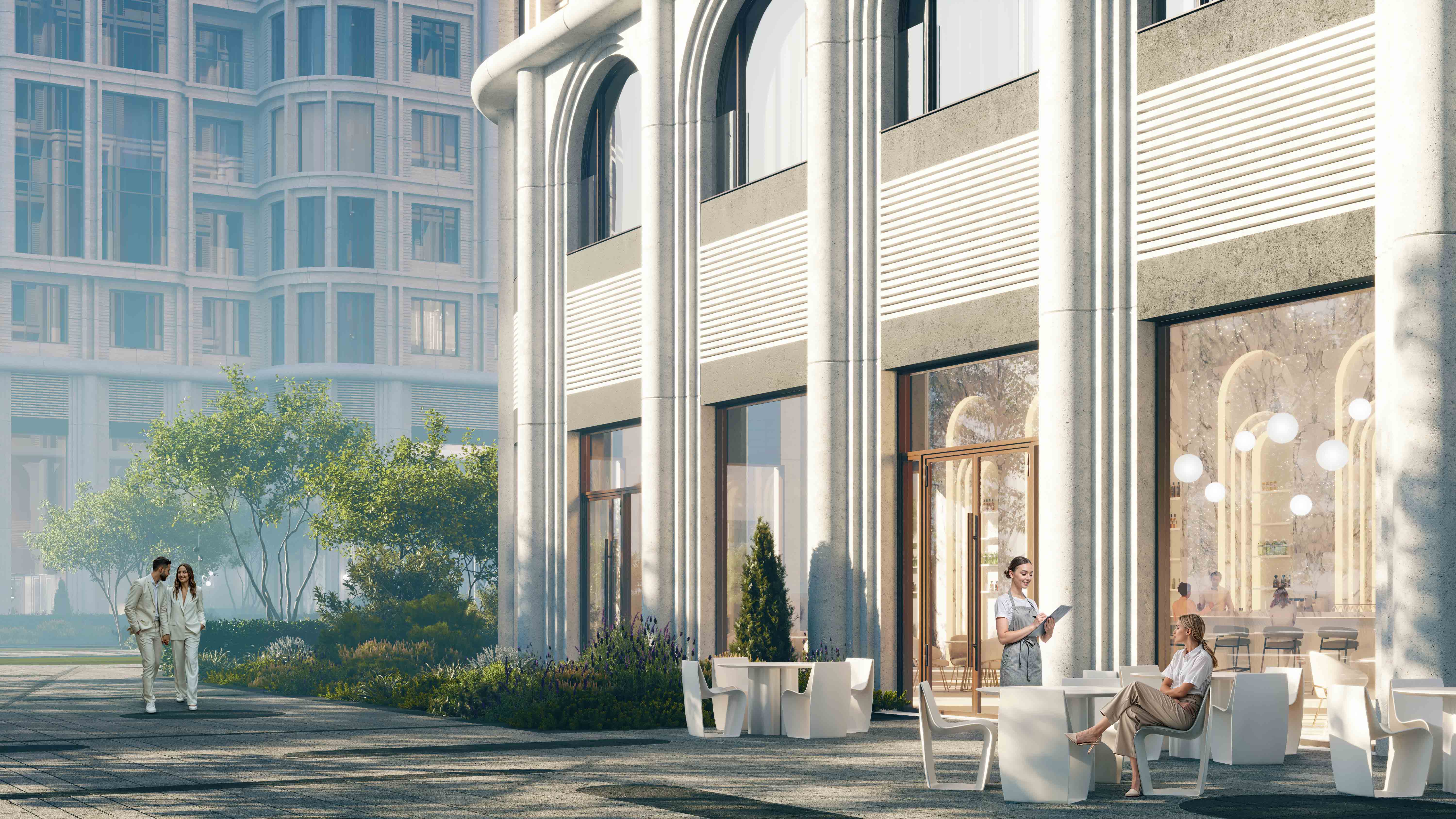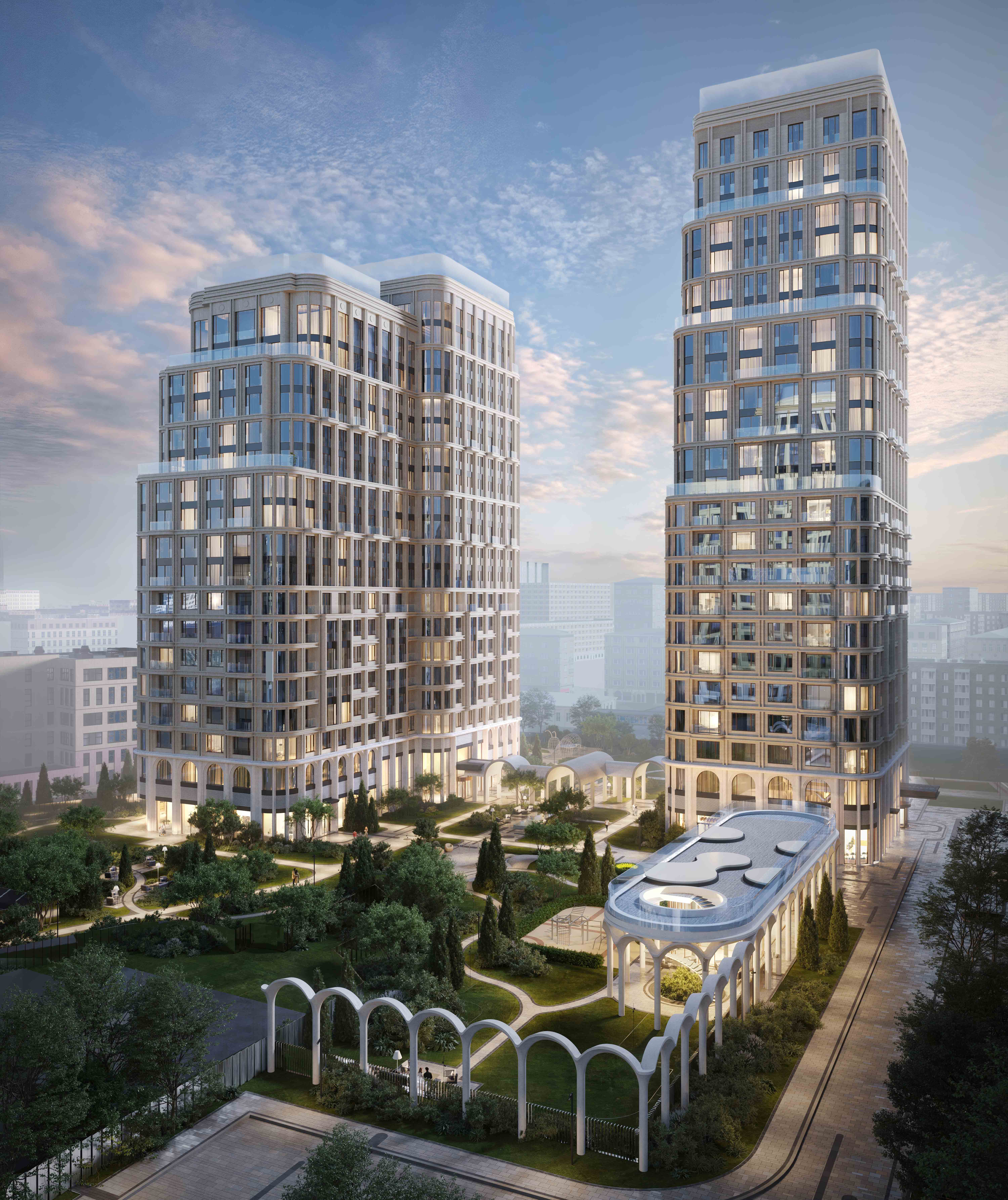 Внутренняя инфраструктура. Предусмотрено лобби с потолками до 8,5 м, ресепшеном, зонами ожидания, постаматами и зонами для курьеров. Общественные пространства займут более 700 кв. м площадей. Появятся детская, кафе, кинотеатр, библиотека, репетиторская, спорт-румы, бьюти-пространства, гостевые комнаты и деловое пространство, включающее коворкинг, переговорную и сигарную. Будет работать трехуровневый велнес-центр с тренажерным залом, бассейном, сауной, хаммамом и массажным кабинетом.