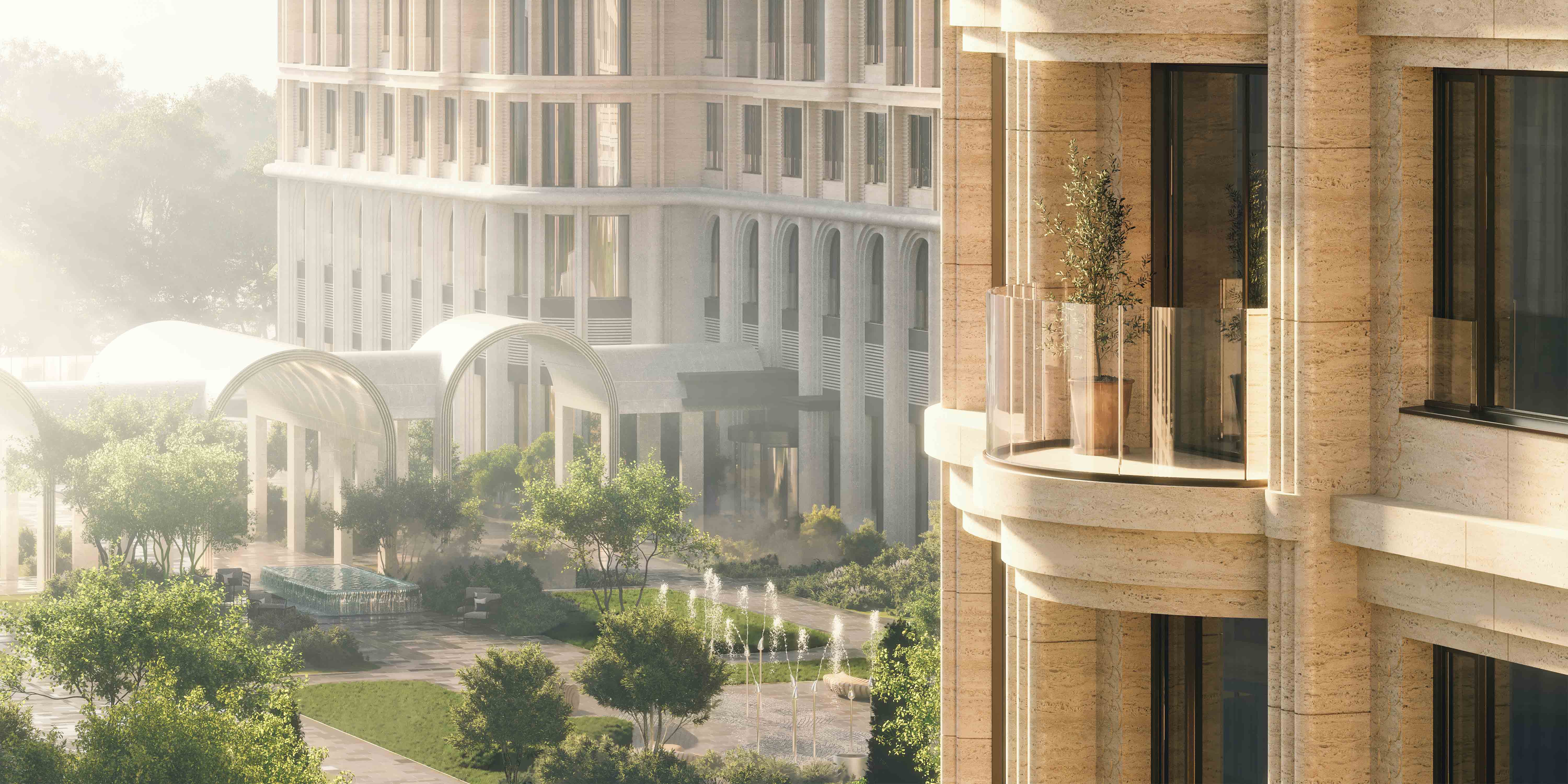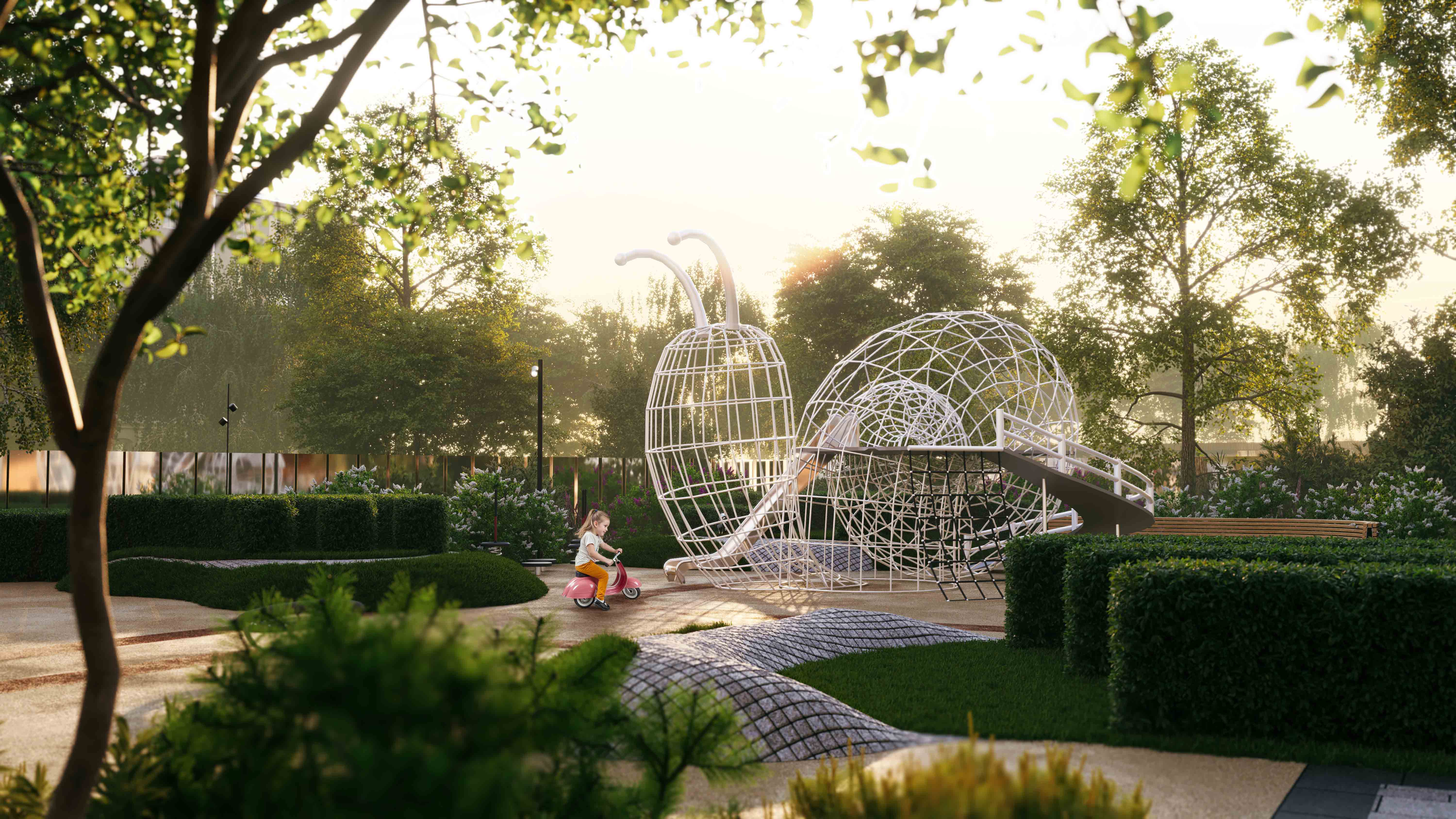 Разобьют двор-сад на 1,8 гектара. Половина территории будет с деревьями, кустарниками и лужайками. Здесь будет входная площадь с фонтаном, каскадный фонтан, аллеи, детская и спортивная площадки, лаунж с вечерней подсветкой, зеленые кабинеты, патио с арт-фонтаном, событийная площадь и крытая галерея.