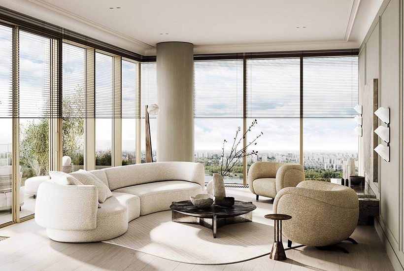 В комплексе представлено 150 квартир с чистовой отделкой, в том числе видовое жилье, двухуровневые таунхаусы с патио и пентхаусы с террасами на 8,7-186 кв. м. Площадь жилья – 61,6 -347,9 кв. м. Высота потолков составляет 3,1-4,5 м. Предусмотрено трансформируемое остекление. Продажи квартир стартовали в сентябре 2024 года.