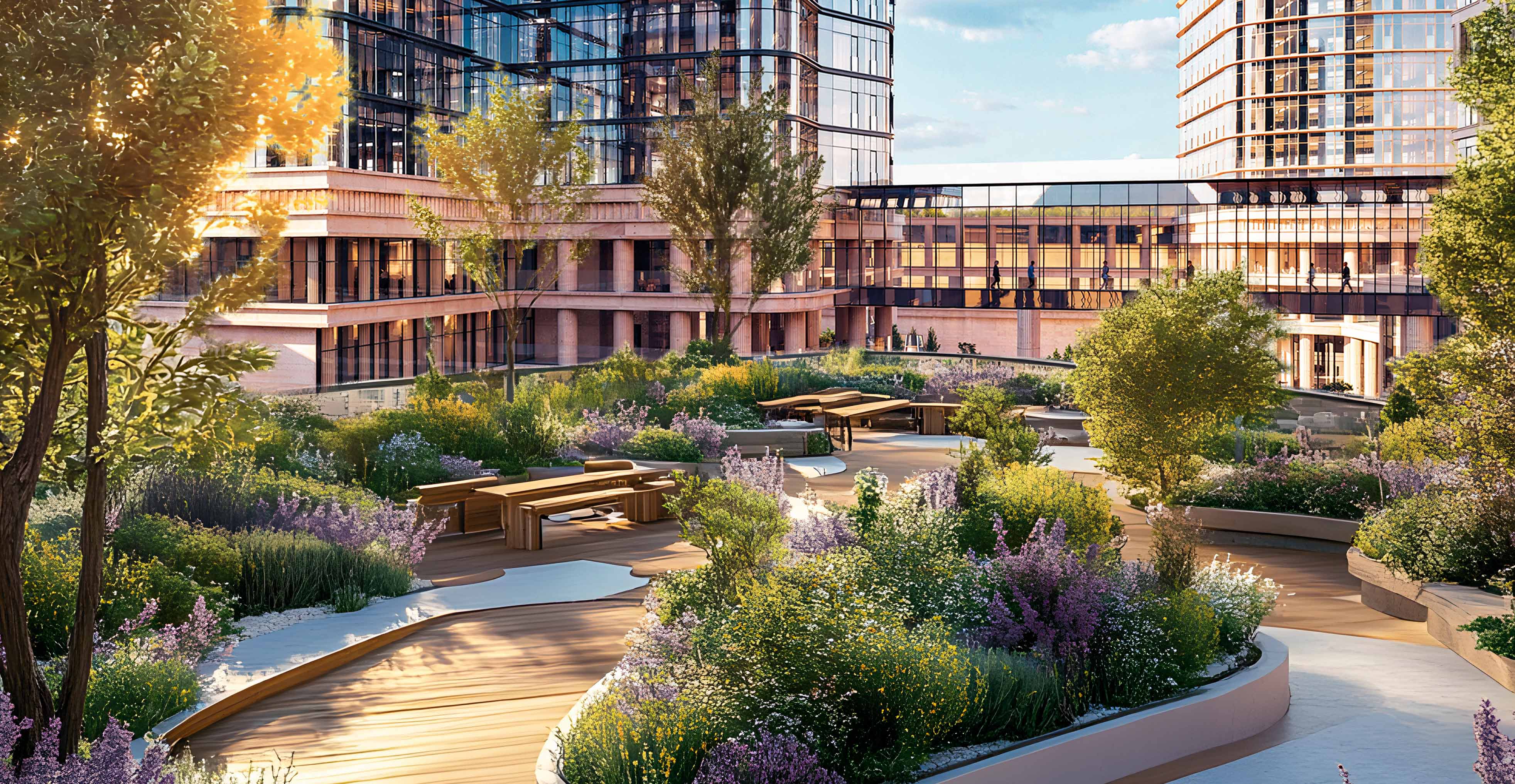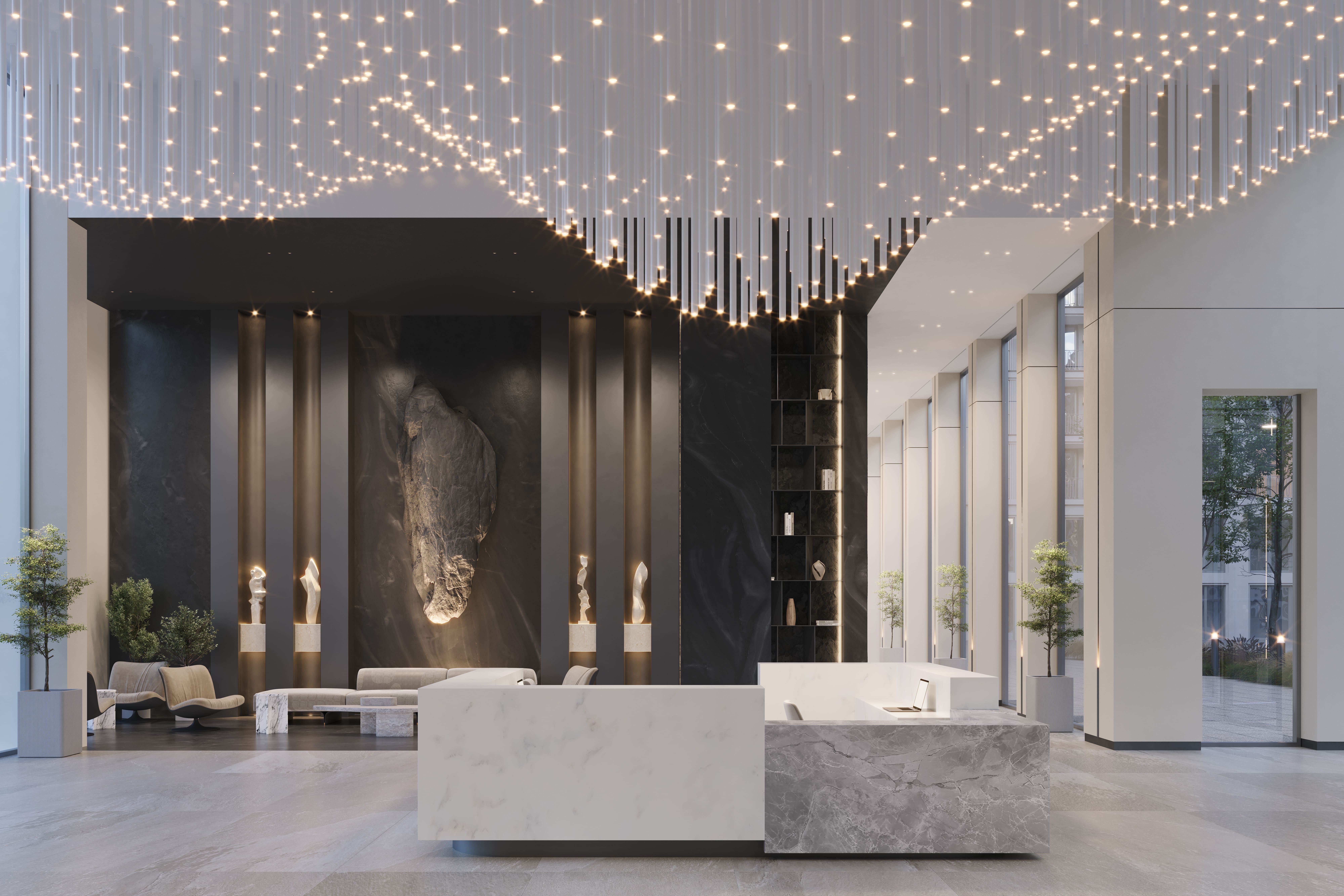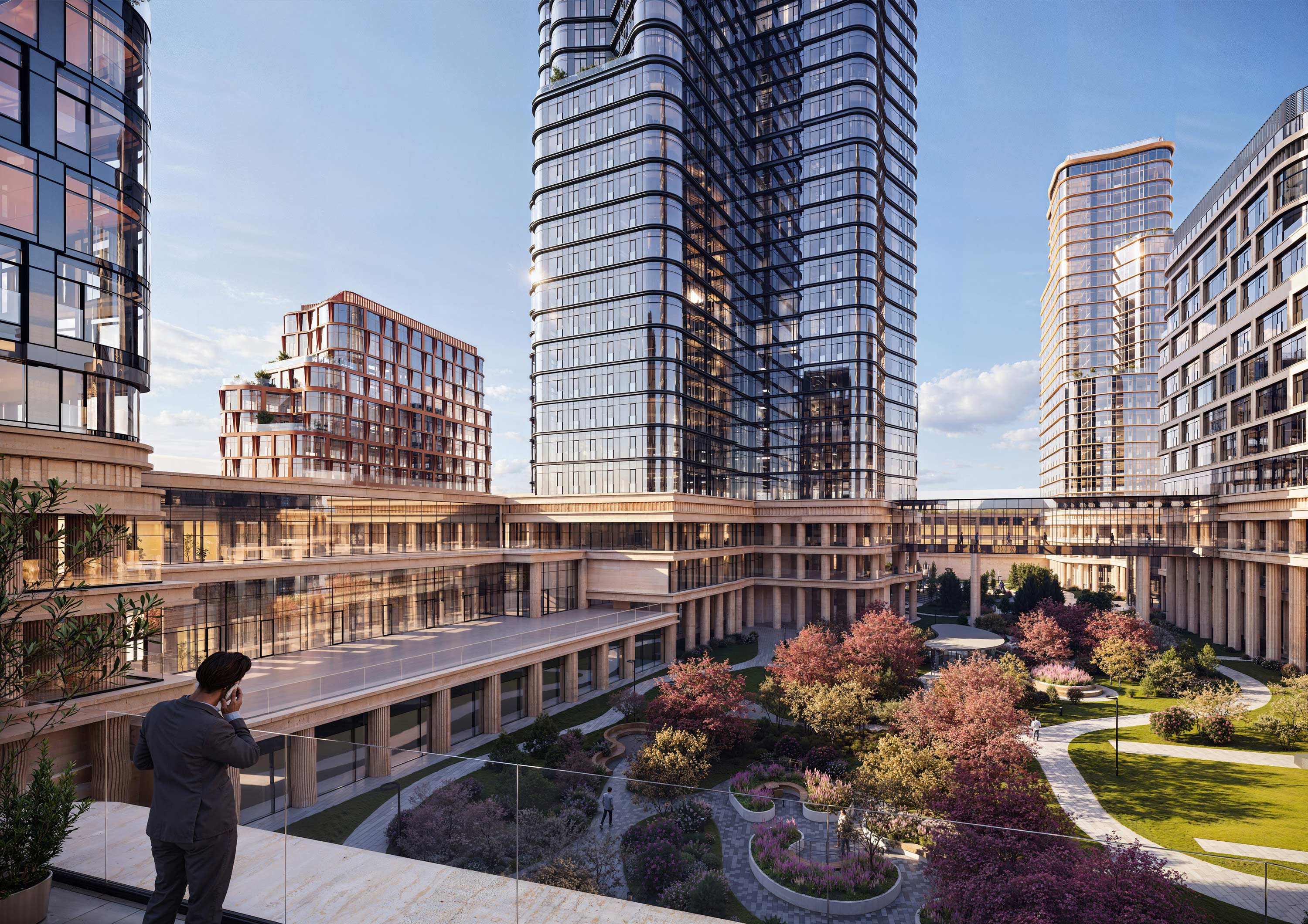 Внутренняя инфраструктура. В корпусах будут центральные входные группы площадью до 286 «квадратов» и высотой 6-7 м, подогрев наружных участков мощения, оформление с применением растений и водных элементов, стойка ресепшен, лаунж-зоны и почтовая зона. Предусмотрены круглосуточные услуги консьержей и специалистов сервиса. В комплексе появится образовательный центр с детским садом на 150 мест и школой на 500 мест. В корпусе № 7 откроется комьюнити-центр на 1,3 тыс. кв. м, включающий фитнес-студию, детский клуб, переговорные и репетиторские комнаты, библиотеку и кинозал. Также будет работать фитнес-центр на 2,3 тыс. кв. м с бассейном на 25 м, кафе, рестораны и мини-маркет.