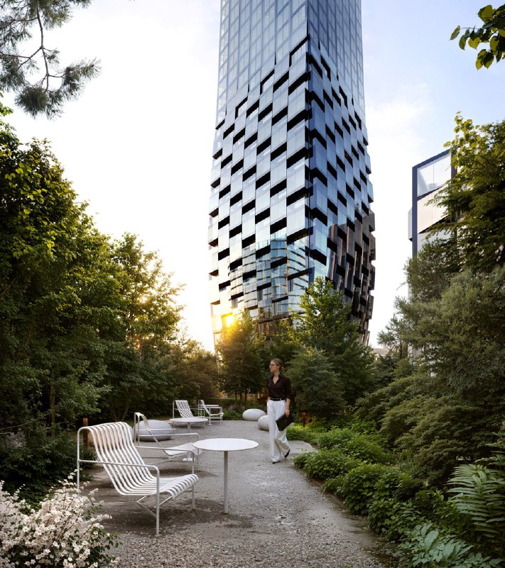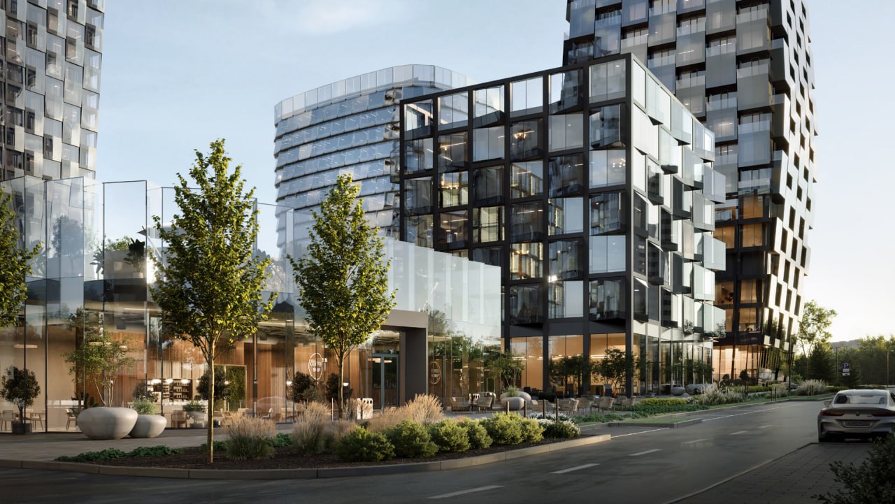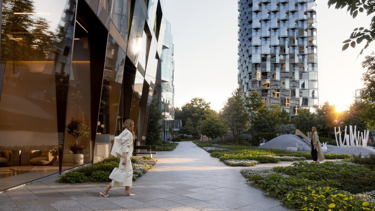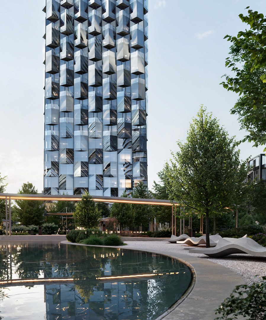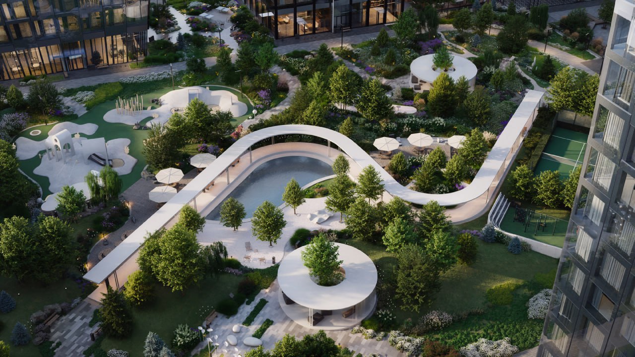 Внутренняя инфраструктура. Сделают двор-парк с ландшафтным озеленением, водоемом, зигзагообразным бетонным навесом, лаундж-зонами, детскими площадками, площадками для падл-тенниса и ворк-аута. Будет лобби с потолками высотой 6-6,75 м, колясочными, почтово-курьерскими зонами и лапомойками. Также будет ИИ-консьерж-сервис и доставка. Клубные пространства для резидентов включают спортзал, классы для танцев и йоги, пространство с мини-кухней, детскую комнату и арт-мастерскую.