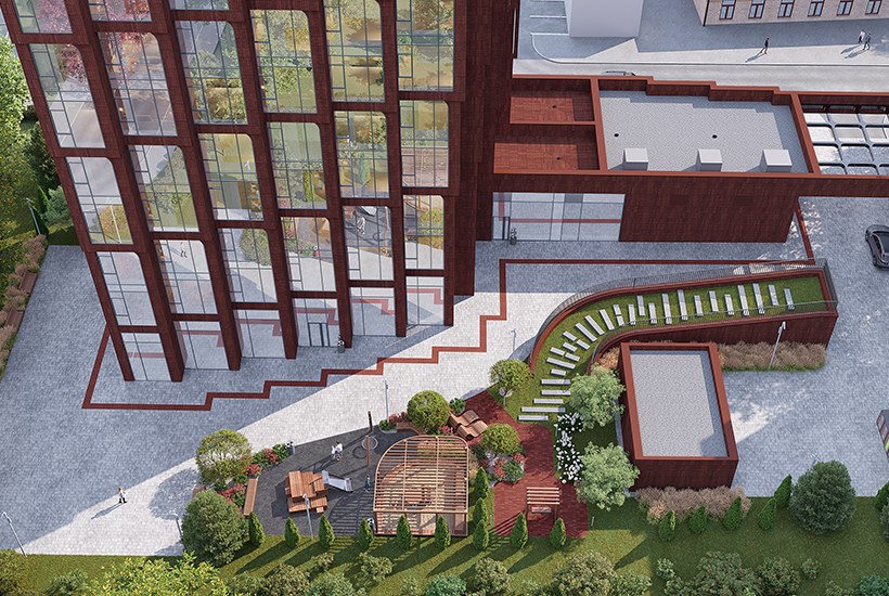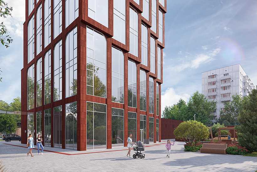 Внутренняя инфраструктура. Перед входной группой сделают стеклянный навес. На территории оборудуют детскую площадку. На одном подземном уровне появится паркинг на 34 машино-места и 20 кладовых.