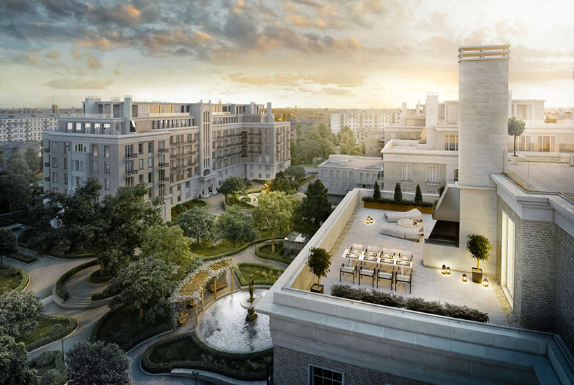 ЖК Найтсбридж в Москве построен в неоклассическом стиле, четыре особняка высотой в 7 этажей объединены единой парковой зоной. Эффектный внешний вид достигается за счет отделки фасадов натуральным камнем, облицовочными материалами премиального качества.