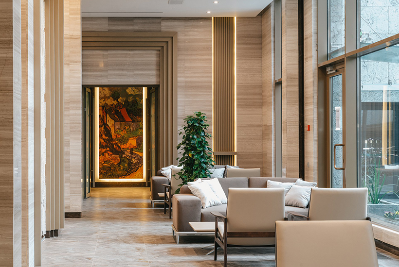 Входная группа с 5-метровыми потолками отделана камнем и деревом. Стены облицованы мрамором Serpeggiante Light и темным керамогранитом Cotto D’Este Exedra Pulpis Glossy. Проходы обрамлены порталами из дуба. Зона ресепшн имеет «хрустальную стену» от компании Aldit и стойку ресепшн из мрамора Serpeggiante Olive с инкрустацией из оникса Onyx Miele с изображением оливкового дерева (символ дома). Также установлена мягкая мебель.