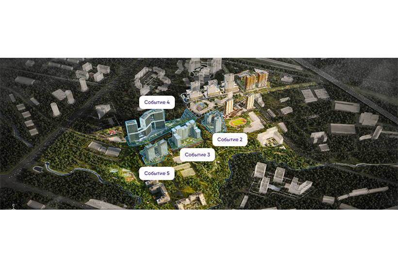 Общественные пространства в домах СОБЫТИЯ не ограничиваются только лобби. Есть в них и детские клубы для самых маленьких жителей СОБЫТИЯ, и фитнес-румы для любителей спорта, и коворкинги для работы. В СОБЫТИИ 2 и 3 террасы на крышах превратились в уютные лаунж-зоны с мобильной мебелью и шезлонгами. В СОБЫТИИ 5 планируется открыть собственный ресторан. СОБЫТИЕ 4 - единственный в Москве "вертикальный город будущего", в котором на разных уровнях дома, от земли до неба, есть всё для отдыха и работы, спорта и общения.