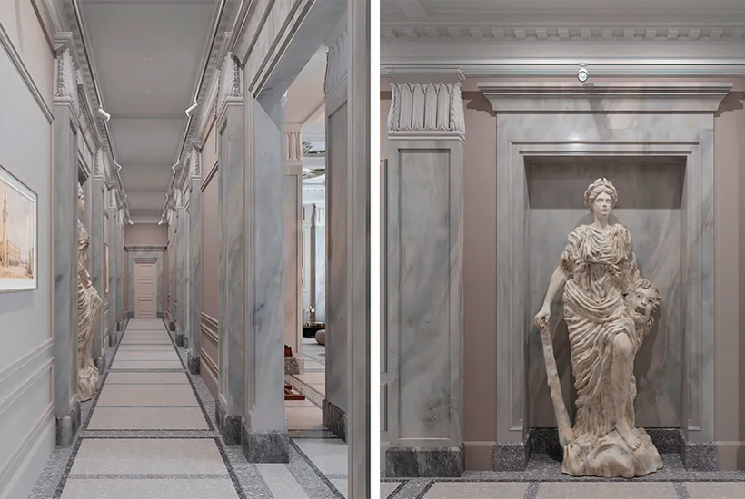 Потолки высотой напоминают «сталинки» —3,3-3,6 м. На цокольных этажах можно купить объект с потолками от 4,5 м. Выходная группа представлена в виде фойе площадью до ста квадратных метров. Все внутренние домовые коридоры, места для общей эксплуатации усилят колоннами.