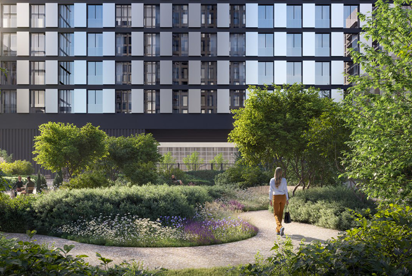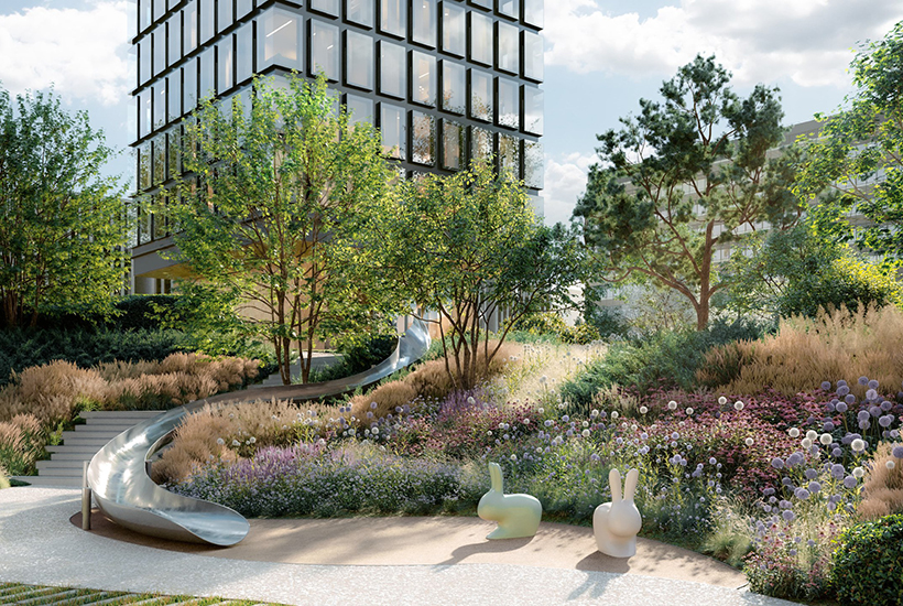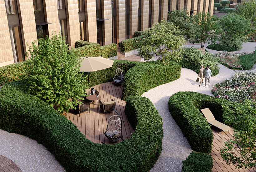 Двор-парк площадью 1,7 гектара будет всесезонным: озеленение включает деревья и другие растения с разными периодами цветения. Территория разделена на зоны активного и спокойного отдыха – спортивная площадка и воркаут-зона по стандарту Fit Lab, а также пространства с гамаками, беседками и шезлонгами, создана развивающая детская площадка по стандарту Kid’s Lab. В подземной части оборудуют одноуровневый паркинг на 410 мест.