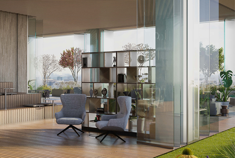 Внутренняя инфраструктура. На седьмом этаже расположится общественная терраса sky lobby. Будет Air Fitness с окнами-трансформерами. На первом этаже оборудуют mute room – комнату с звукоизоляцией для занятия вокалом и медитации. На двух подземных этажах сделают паркинг с 153 машино-местами и 30 кладовыми помещениями.