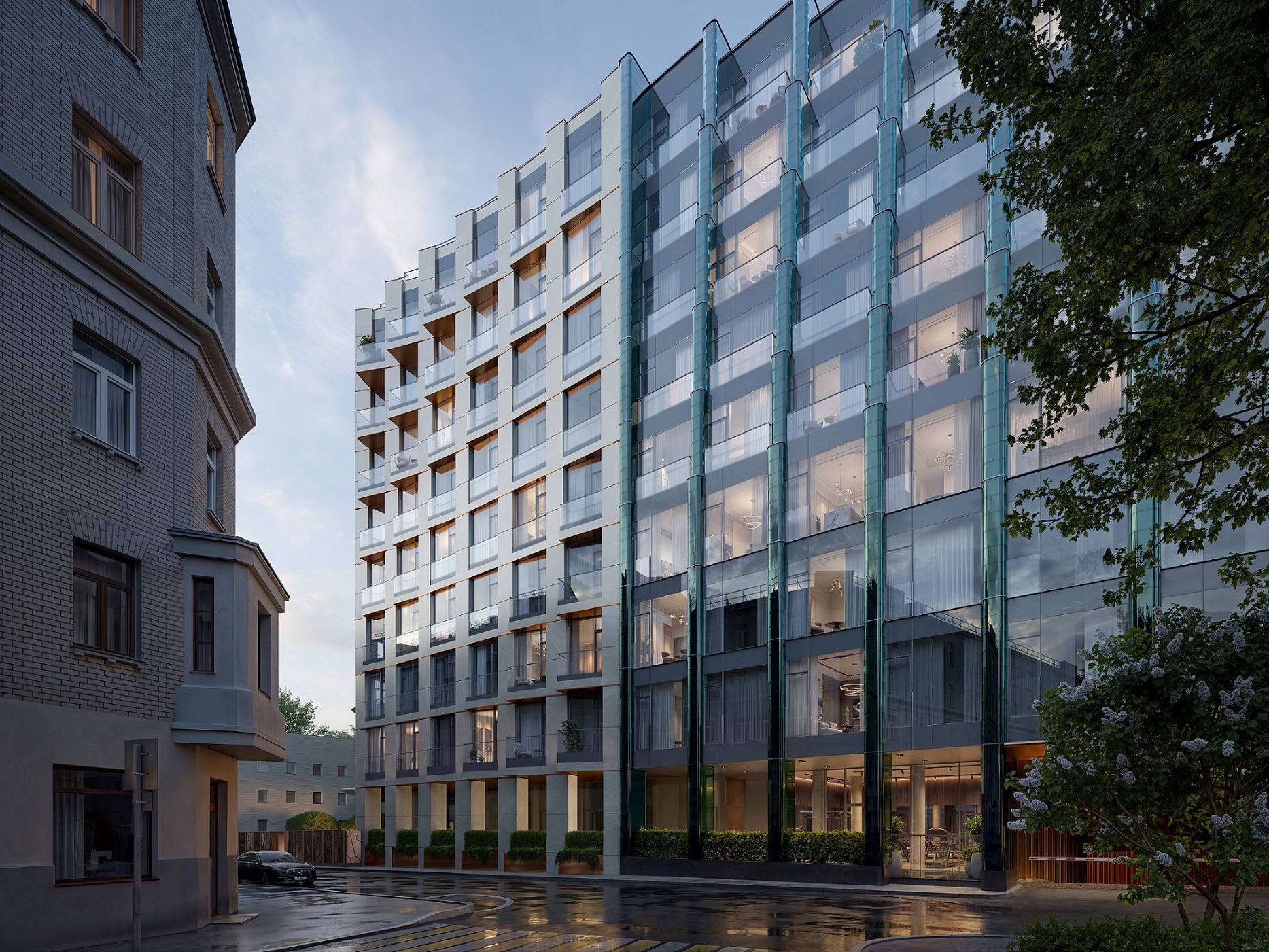 Три уникальных фасада от ADM: стеклянные полуколонны, камень с волнообразными балконами, белый глянец с консольными террасами до 4 м. 8–9 этажей, сохраняет исторический масштаб, но создаёт современную доминанту.