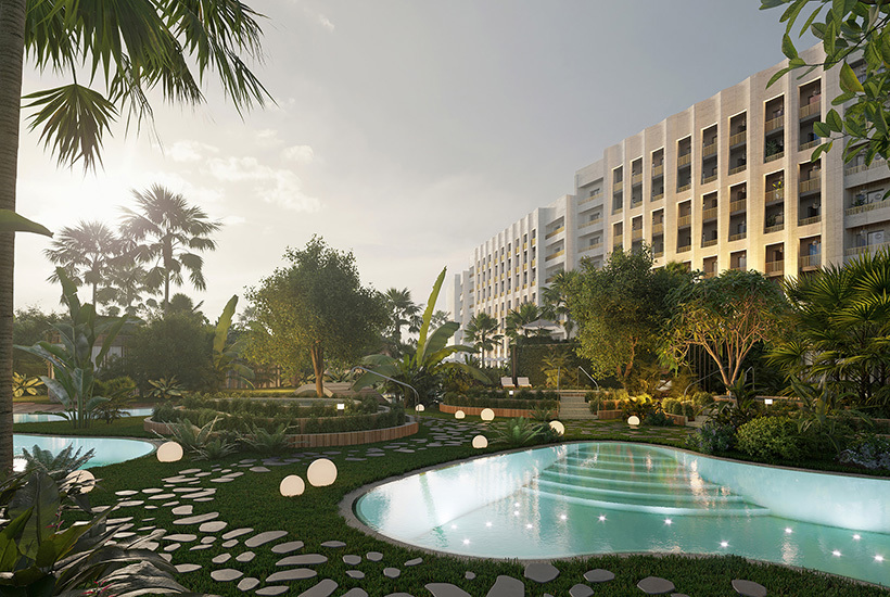 Коллекционные лоты в проекте – виллы и пентхаусы. В восточной части комплекса находится 11 двухэтажных вилл площадью 255-571 кв. метр. Первый этаж отведен под кухню-гостиную с лаундж-пространством, гостевую спальню, гардеробные и ванные комнаты. Второй этаж занимают спальни с выходами на террасы, ванные комнаты. Затем идет смотровая площадка на крыше – лаундж-зона на 50 кв. метров с бассейном, беседками и летней кухней. Для большей приватности можно использовать выдвижные маркизы и теневые перголы.
