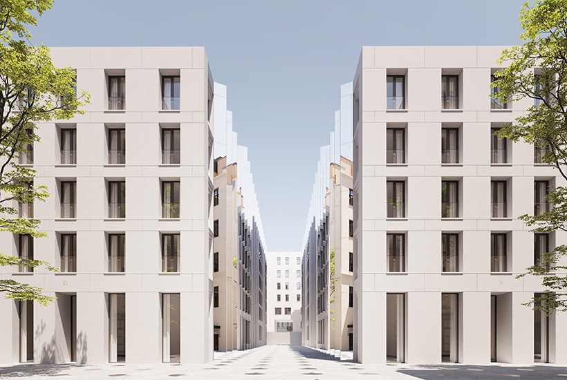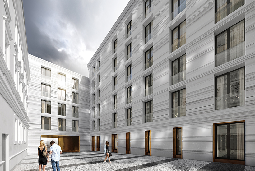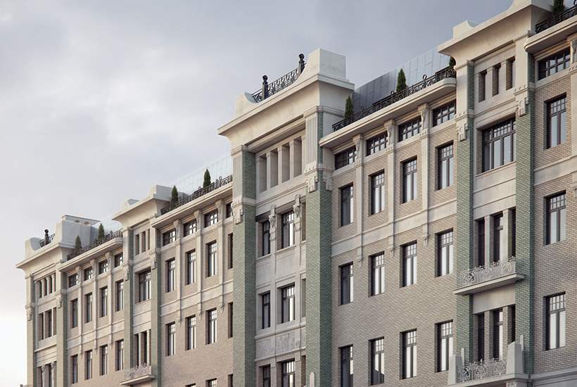 Остальные два дома – современные, расположенные во внутреннем дворе. В одном из них будут белые фасады из архитектурного бетона, с использованием французских балконов с чугунными оградами и вертикального озеленения. В другом – темные, с применением скальных горных пород (гранит и кварцит) и стеклянными балконами. Стойки лобби выполнят из натурального камня. На подземном уровне этих двух зданий сделают паркинг на 207 машиномест (стандартные, средние под машины S-класса и большие для внедорожников Cadillac Escalade), отдельный лифт для спорткаров и станцию для зарядки электрокаров.