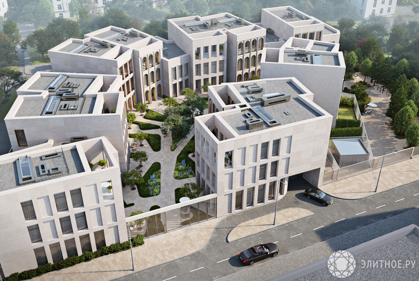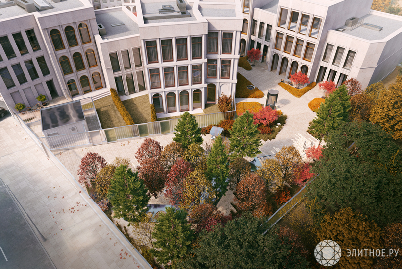 Внутренняя инфраструктура. На территории разобьют сад и парк с мощеными дорожками, без транзитного проезда автомобилей. Пространство благоустроят с сочетанием трех минеральных фактур: матового гранита бежевого оттенка с термообработкой, натурального газона и гравия. Территорию будут круглосуточно охранять.