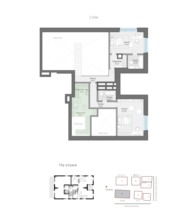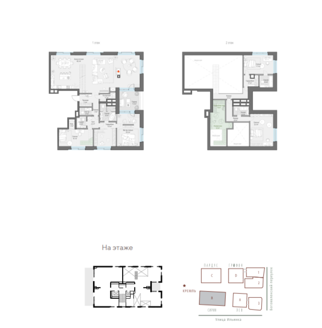 Проект включает 58 апартаментов на 40-230 кв. метров и два трехэтажных особняка метражом до 678 «квадратов» с отдельным входом, фитнесом, каминами и потолками высотой до 6 метров. Предусмотрены пентхаусы с каминами, террасами, потолками высотой до 6 метров, апартаменты на первом этаже с патио и зеленой изгородью. Продажи стартовали в июне 2022 года. Цена кв. метра стартует от 2 млн рублей.
