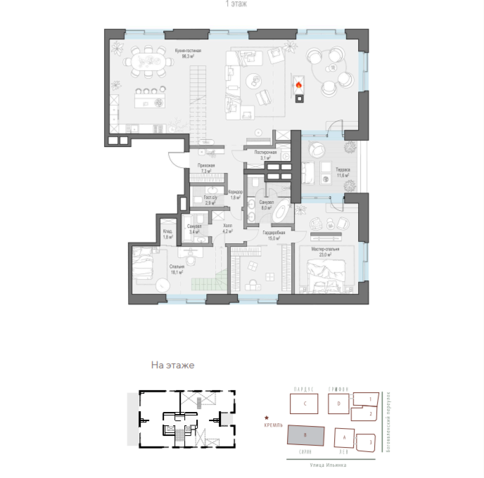 Район. Комплекс расположен у станции метро «Площадь Революции», примерно в 300 метрах от Кремля и парка «Зарядье». Рядом находится ГУМ, торговый центр «Никольский пассаж» и Гостиный двор. Пешком можно дойти до школы № 179.