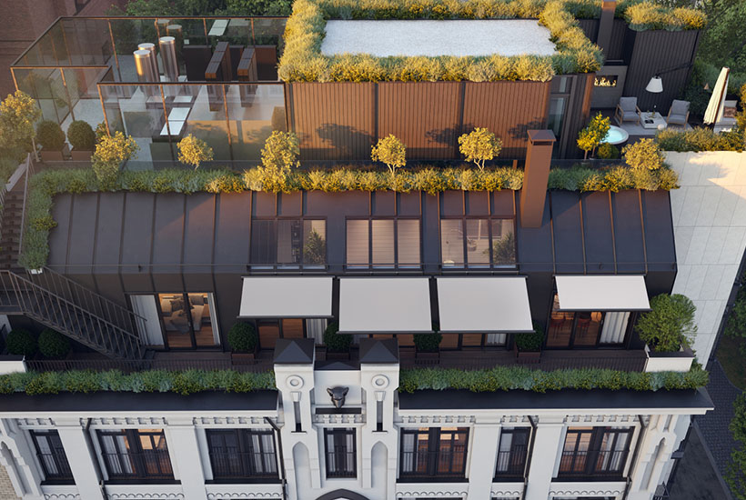 На верхнем этаже в доме есть просторная терраса. Для украшения интерьера дизайнеры провели озеленение и оформили мансарду в виде мини-сада с местами для отдыха. В этом жилом комплексе будет комфортно каждому человеку, который любит домашний уют.