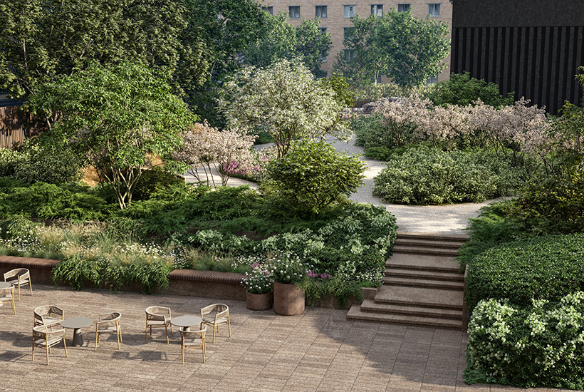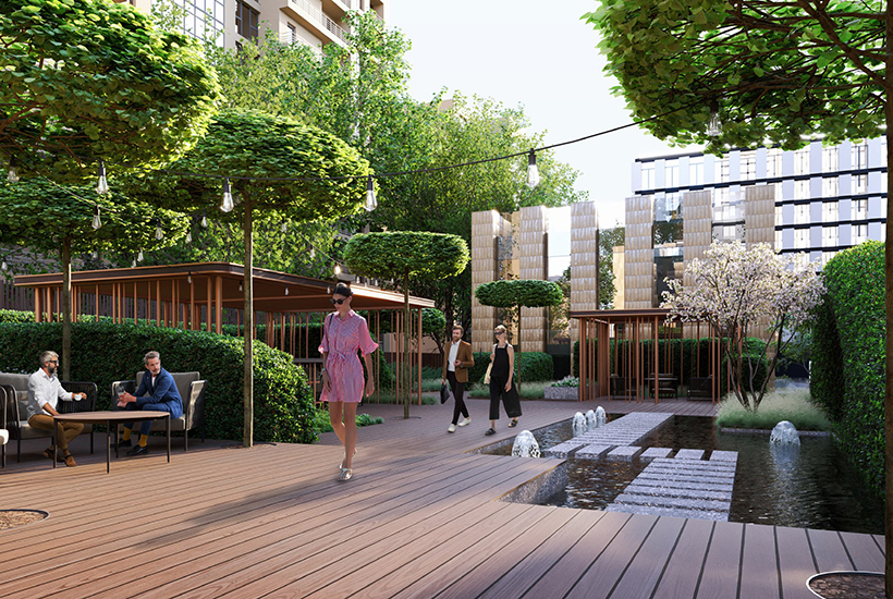 Двор-парк площадью 1,7 гектара будет всесезонным: озеленение включает деревья и другие растения с разными периодами цветения. Территория разделена на зоны активного и спокойного отдыха – спортивная площадка и воркаут-зона по стандарту Fit Lab, а также пространства с гамаками, беседками и шезлонгами, создана развивающая детская площадка по стандарту Kid’s Lab. В подземной части оборудуют одноуровневый паркинг на 410 мест.