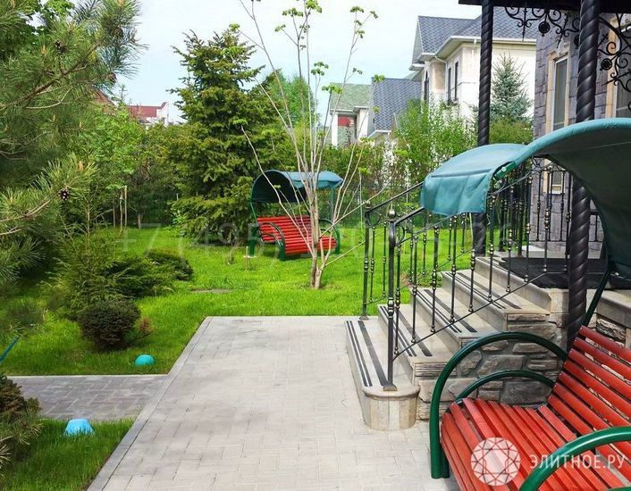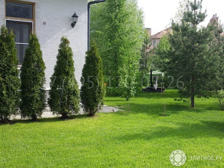 Участок ухоженный: газон, много хвойных и лиственных деревьев, цветущие кустарники, молодой плодоносящий сад, ягодные кусты.
